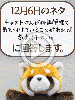 【12月6日のネタ回答】 キャストさんが体調管理で気を付けていることがあれば教えて下さい。 キャスト紹介 2025.12.06 ↑↑動画をご覧ください↑↑ 12月6日のネタ キャストさんが体調管理で気を付けていることがあれば教えて下さい。 【回答】 当店在籍女性にインタビューしてきましたので、今から動画を流したいと思います。 では…動画の方を…どうぞ!! どうぞ!